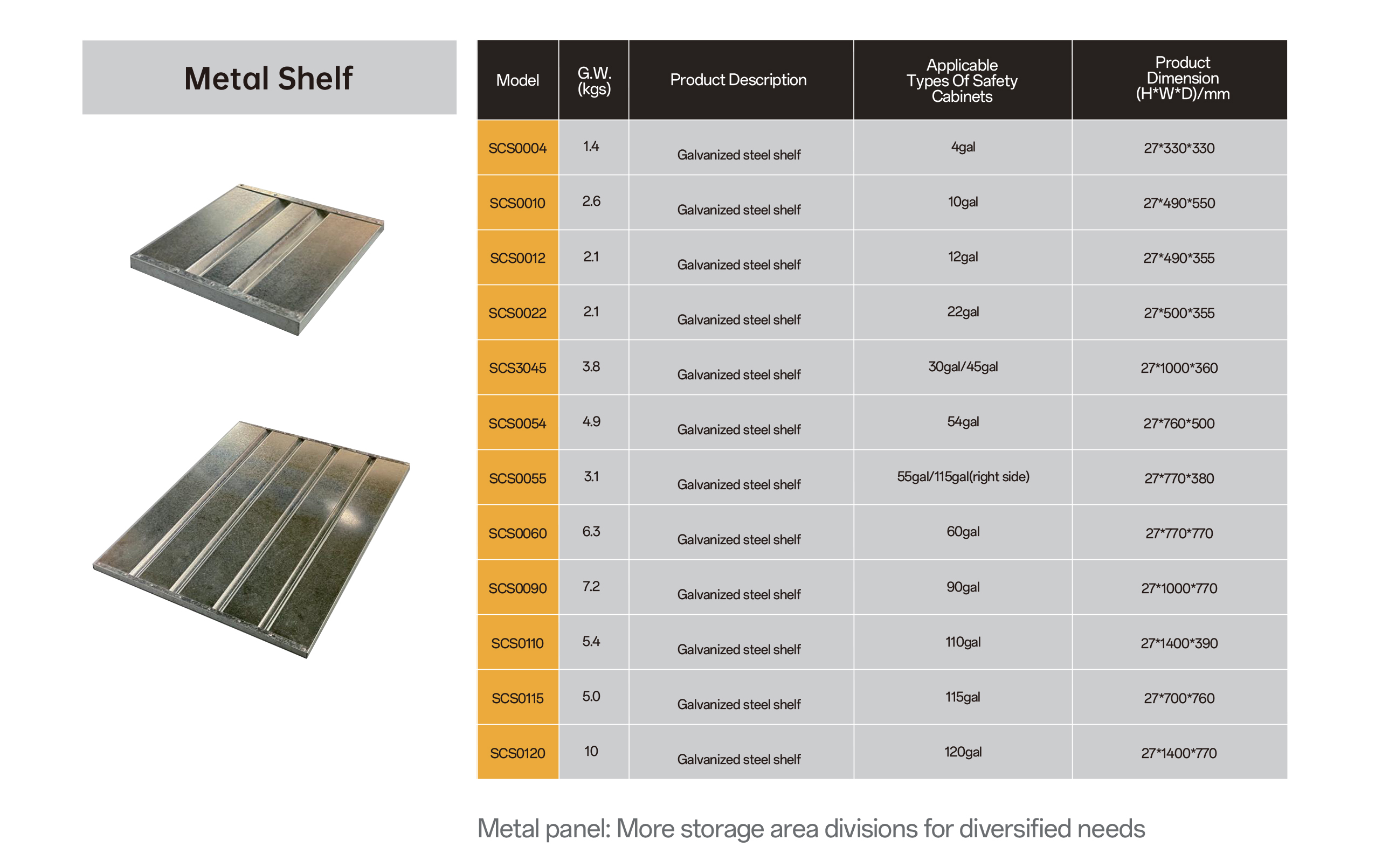 Used with SAI-U® steel safety storage cabinet, made of galvanized steel. Different sizes are suitable for different types of safety cabinets. It has the characteristics of sturdiness and corrosion resistance.