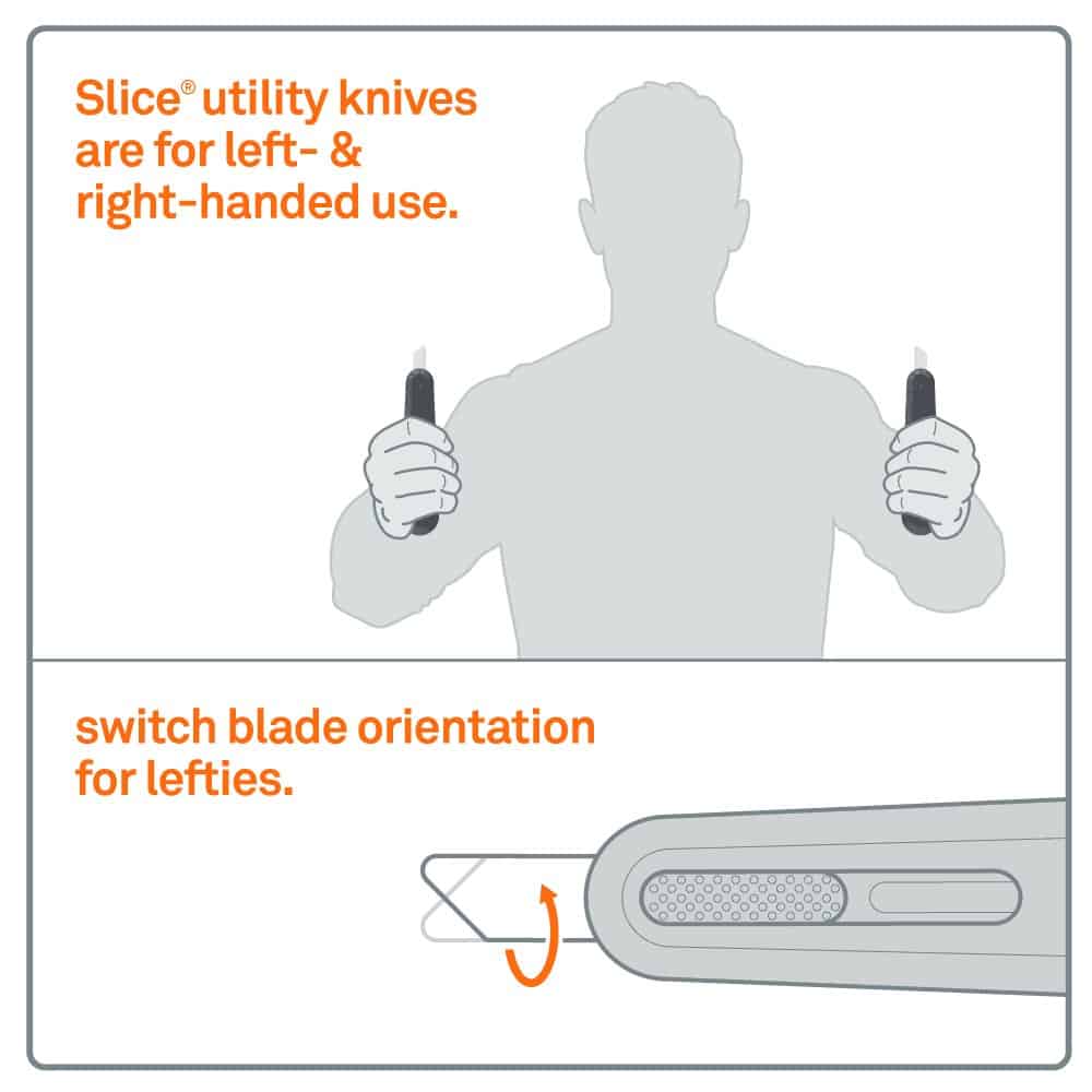 The Slice 10554 auto-retractable utility knife responds to customer demand for a long blade to cut through thick materials, including triple-walled corrugated. When your cut is finished, the ceramic safety utility knife blade pulls back to keep you safe. Rotate the blade edge quickly and without tools to adjust for right or left-handed use. As with all our ceramic blades, the retractable utility knife blade is non-conductive, chemically inert, and never rusts.